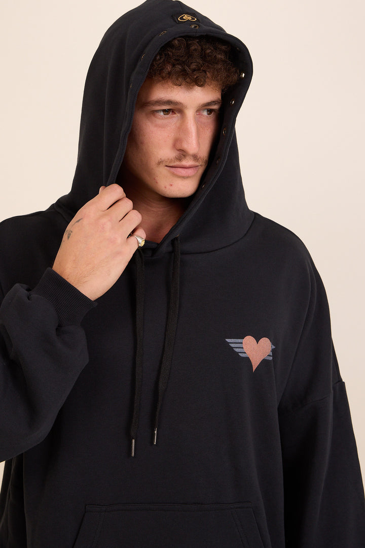 Made from soft, premium French Terry cotton in a deep black shade, featuring a small front print of a winged heart with the number 777, and a large back graphic with the phrase Let your heart soar.