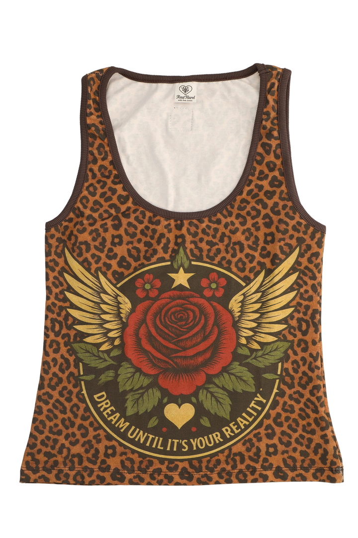 Print: Original all-over print – leopard background in terracotta brown tones with central graphic of a rose with wings