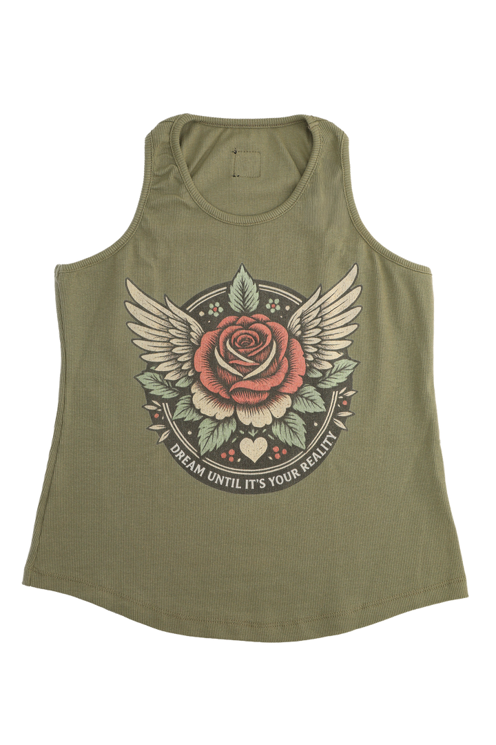 Crafted from ribbed knit fabric (95% cotton, 5% lycra) in military green, featuring an original graphic print of a red rose with golden wings, a golden heart, and the quote “Dream Until It’s Your Reality.”