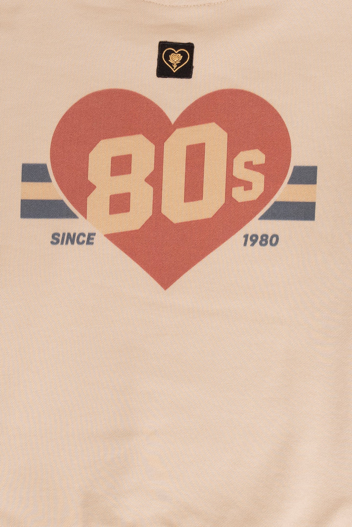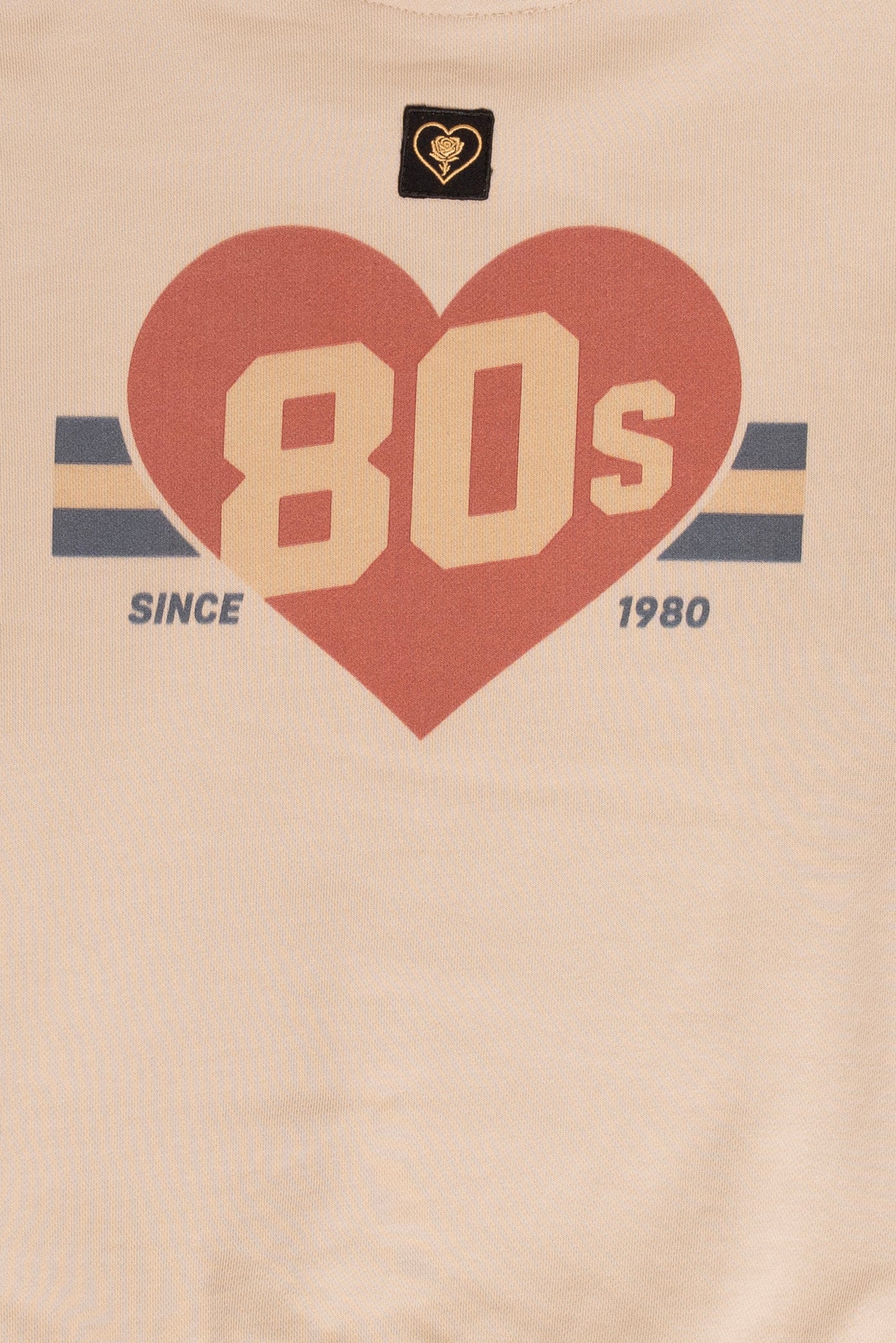 Women's sweatshirt in a relaxed, soft French terry fabric, featuring a cream tone with red collar and stripes, and a large 80s heart print on the front and back. A retro-chic design that blends everyday comfort with a playful, nostalgic vibe inspired by the vibrant spirit of the 1980s.