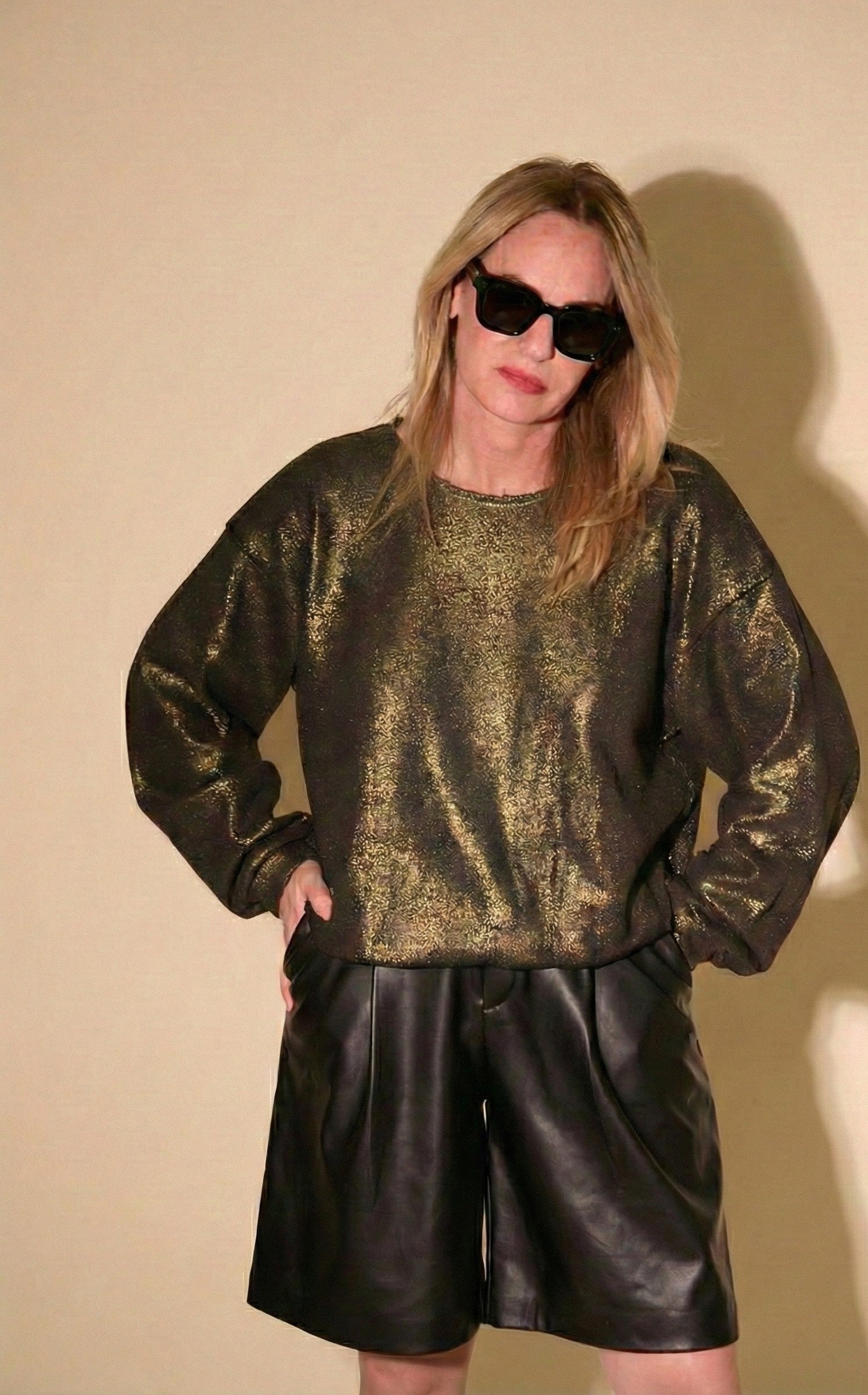 Designed in a relaxed silhouette with a soft drape and raw-cut hemline, creating an effortless balance of comfort, shine, and modern edge.