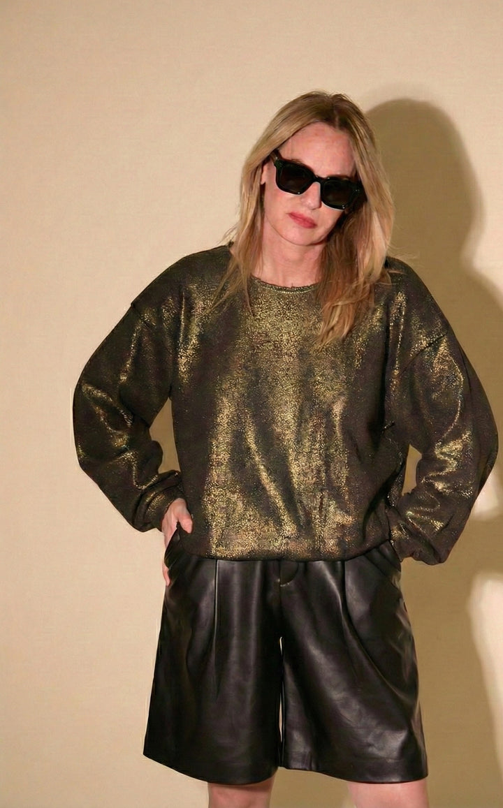 A premium women’s sweater crafted from 100% cotton with a subtle black–gold lurex finish.