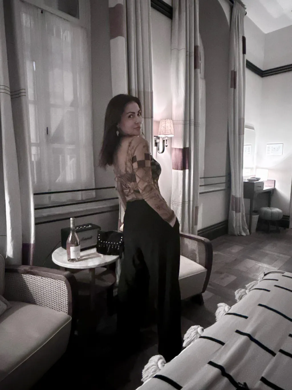 A sheer mesh shirt featuring a bold, tattoo-inspired chessboard motif an original print designed by Reut Harel.