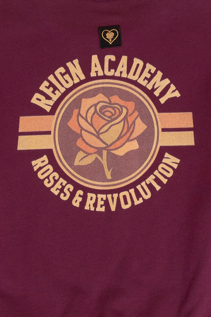 The front features a small rose and “R” print, while the back showcases a large vintage-style “REIGN ACADEMY ROSES & REVOLUTION” graphic.